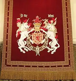 Adopted during the reign of the Stewart dynasty, and certainly in use by the reign of James IV (1488–1513),[6] In my defens God me defend was originally the only motto associated with Scotland's royal arms,[7] with versions appearing in both truncated and abbreviated forms;[8] In my defens, for example, having been adopted for the royal arms of James IV. (An embroidered wall hanging depicting these arms is displayed in the Great Hall at Stirling Castle). Later versions of the arms which feature the abbreviated form in defens include the armorial by Sir David Lyndsay of the Mount, which appears in his Register of Scottish Arms (1542).