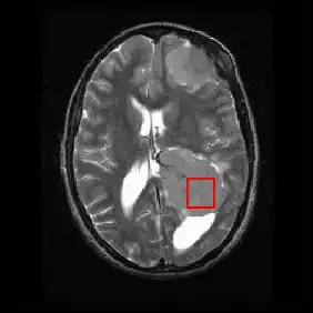 Shown below is an MRI brain scan (in the axial plane, that is slicing from front-to-back and side-to-side through the head) showing a brain tumor (meningioma) at the bottom right. The red box shows the volume of interest from which chemical information was obtained by MRS (a cube with 2 cm sides which produces a square when intersecting the 5 mm thick slice of the MRI scan).