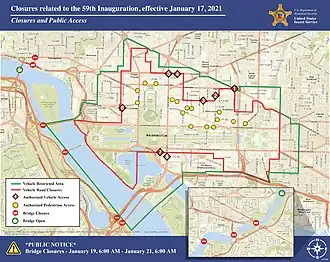 - The National Mall, which served as a non-ticketed viewing area in past ceremonies, and Washington Monument at its geographic center, were closed to the public.[47] Much of the surrounding downtown area near Capitol Hill, Union Station, the Lincoln Memorial, and White House came under significant parking restrictions and road closures.[48][49]