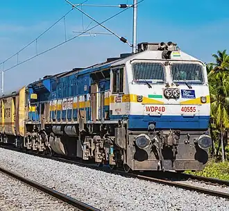 The Indian locomotive class WDP-4 (EMD GT46PAC) is a passenger-hauling diesel–electric locomotive with AC electric transmission designed by General Motors Electro-Motive Division and built by both GM-EMD and under license by Banaras Locomotive Works (BLW) of Varanasi, India for Indian Railways as the classes WDP4, WDP4B and WDP4D.[1] The GT46PAC is a passenger version of the previous Indian Railways EMD GT46MAC freight locomotive. The locomotive has a 16-cylinder 710G3B diesel engine and is one of the fastest diesel–electric locomotives in service in Indian Railways.[2]