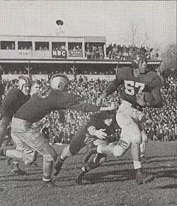 Bo McMillin is the only head coach to lead Indiana football to an outright Big Ten Championship.[4] In 1945, the Hoosiers achieved their only unbeaten season (9–0–1).[4] The achievement earned Coach McMillan the title of Man of the Year (by the Football Writers Association) and Coach of the Year (by the Football Coaches Association).[12] Part of the team's success in this period is attributable to George Taliaferro, an African-American who helped break down color barriers in sports and played for the Hoosiers two years before Jackie Robinson suited up for the Brooklyn Dodgers.[13] A three-time All-American, Taliaferro led the Hoosiers in rushing twice, punting in 1945 and passing in 1948.[13] He helped lead the 1945 undefeated team.[13] Under Coach McMillin, IU had 10 winning seasons, including a stretch of six consecutive years.[12] His Big Ten record of 34–34–6 is the best of any Indiana coach, as is his overall winning percentage (.562).[4] His overall record at IU is 63–48–11.[12] On September 23, 1946, McMillin was named Indiana's athletic director.[14] Clyde Smith left Wisconsin La-Crosse and came to the Hoosiers as head football coach following McMillin's retirement.[4] The Hoosiers struggled mightily under Smith, as they failed to win more than three games in a single season with Smith at the helm.[15] Smith's final record at IU is 8–27–1.[15] Bernie Crimmins came to Indiana from his post as an assistant under legendary coach Frank Leahy at Notre Dame and brought along high hopes that IU football prominence would be restored.[4] However, it didn't happen. Like his predecessor, Crimmins failed to win more than three games in a single season, with yearly records of 2–7, 2–7, 3–6, 3–6 and 3–6 for a final record of 13–32 in five seasons.[4][16] Crimmins was fired as head coach and returned to Notre Dame as an assistant.[17] Bob Hicks came to Indiana from his post as an assistant at Wyoming.[4] He took over the Hoosiers football program for one season while Phil Dickens was being investigated for alleged NCAA violations.[4] He went 1–8 in his only season as head coach, failing to win a single Big Ten game.[4][18] He returned to his post as assistant coach for the Hoosiers after Dickens was reinstated.[4]