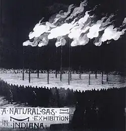 As the use of the gas grew, many scientists warned that more gas was being wasted than was effectively used by industry, and that the supplies would soon run out. Almost every town in northern Indiana had one or more gas wells. Many were purchased by local governments, which used revenues for community amenities. Many towns and cities installed free gas lighting throughout their communities, supplied by their own gas wells.[7] Communities also piped gas to private homes to provide cheap heating fuel, helping to make urban living more desirable. Gas was used to produce electricity that ran electric street cars in several cities. Businessmen also established corporations to purchase the gas from the local markets and sell it wholesale on the national market.[8] Producers lit a flambeau atop each well to demonstrate the gas was flowing, a practice that wasted massive amounts of gas each day.