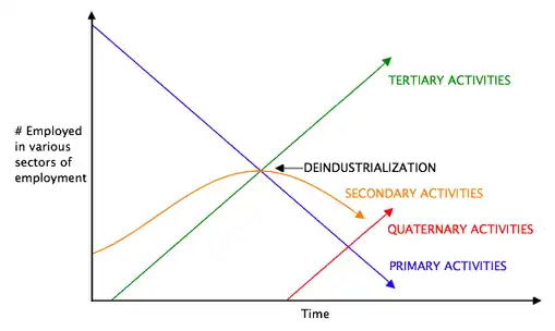 A recent trend has been the migration of prosperous, industrialized nations towards a post-industrial society. This has come with a major shift in labor and production away from manufacturing and towards the service sector, a process dubbed tertiarization.[8][9] Additionally, since the late 20th century, rapid changes in communication and information technology (sometimes called an information revolution) have allowed sections of some economies to specialize in a quaternary sector of knowledge and information-based services. For these and other reasons, in a post-industrial society, manufacturers can and often do relocate their industrial operations to lower-cost regions in a process known as off-shoring.