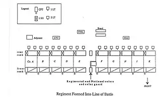 The core of these tactics was organizing soldiers into ranks and files in order to form a regiment into a line of battle or column.[21] The line was the primary formation of combat as it allowed the soldiers to fire a full volley at the enemy. Generally consisting of companies formed up into two ranks with files close enough to touch elbows, the line was held in alignment by placing the regimental colors in the center and a designated guide on either end of the line. File closers spread out just behind the line helped ensure order and prevented soldiers from deserting. Thus organized, a standard 475-man regiment occupied a front of 140 yards.[23] The column was primarily used for maneuvering, with a simple column consisting of companies stacked up behind one another at varying distances. More common was the double column consisting of two stacks of companies next to each other as doing so shortened the formation's length and widened its frontage. Infantry squares were rarely employed, both because they were the most difficult formation to carry out and because they were rarely necessary on Civil War battlefields.[24]