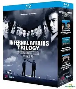 Infernal Affairs is a series of three crime drama films[1] directed by Andrew Lau and Alan Mak, starring Andy Lau and Tony Leung. It tells the story of a police officer who infiltrates the triads, and a police officer secretly working for the same gang. The Chinese title means "the non-stop way", a reference to Avici, the lowest level of hell in Buddhism. The English title is a word play combining the law enforcement term "internal affairs" with the adjective "infernal". The Criterion Collection released the trilogy as a box set on November 15, 2022.