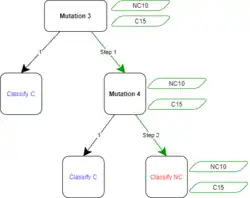 To split the right node, information gain must again be calculated for all the possible candidate splits that were not used for previous nodes. So, the only options this time are Mutations 1, 2, and 4.