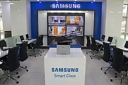 As IUT maintains open doors policy and visitors can enter premises freely, several companies have established information stands in the lobby of the main building of IUT. This gives a chance for companies to present their latest technologies to the wider public. Samsung, KT, and SAP have already established their permanent exhibition stands in the Vision Center, while Microsoft, Hanjin Group, and Korean Air are currently preparing them for initiation. Samsung Smart Class includes application location, curriculum planning, learning management systems and mapping question banks on a tablet. Also, the stand includes the multi-display videowall solution and interactive e-board.[11]