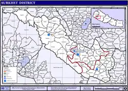 The Surkhet Valley is situated in the Surkhet district, mid-western Nepal. The valley is about 700 m (2,300 ft) above sea level, forming an ellipse about 9 km (5.6 mi) east-west by 6 km (3.7 mi) north-south. It is drained by the Bheri River, a tributary of the Karnali.[18] The district is the homeland of the Raji people.[19] Tharu people from Dang settled in the valley since at least the 19th century.[20]