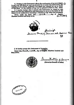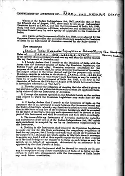 The Jammu and Kashmir Instrument of Accession is a legal document executed by Maharaja Hari Singh, ruler of the princely state of Jammu and Kashmir, on 26 October 1947.[1][2]