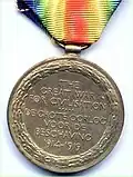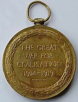 It features an ancient Greek-style Victory on the obverse, and on the reverse the circular inscription Ο ΜΕΓΑΣ ΥΠΕΡ ΤΟΥ ΠΟΛΙΤΙΣΜΟΥ ΠΟΛΕΜΟΣ 1914—1918 ('The Great War for Civilisation, 1914–1918') around the edge, and in the centre a list of the Allied nations, under the title ΣΥΜΜΑΧΟΙ ΚΑΙ ΕΤΑΙΡΟΙ ('Allies and Partners').[1] It was widely awarded to Greek military personnel that fought for at least three months, or was wounded in action, not only in the First World War, but also in the Allies' Southern Russia intervention, and the Greco-Turkish War of 1919–1922.[1]