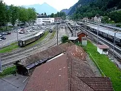 The station seen from the east. The BOB line curves in from the left, serving the leftmost platforms. The Brünig line arrives from the right and serves the central platforms. The Thunersee line arrives from the far end of the station, and serves the rightmost platforms.