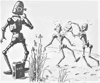 As we first encounter the robums, Napoleon's first attempt to realize his scheme has just miscarried. The kidnapped mendicant intended as his patsy has bolted in panic and been felled by his hench-robot, Hercules; under the heaviness of the latter's blow the victim has been "damaged beyond repair." An alternative plan is adopted, to secure a child they can rear and train. The robum Galahad observes that the absent Homer, another of their number, knows a child — "the Sanborn kid."