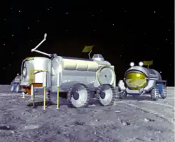 The Moon Bus would have been a large rover designed to accommodate 2 passengers for days or weeks at a time. At least two of these rovers would be positioned at the temporary outpost and would act as crew quarters and mobile labs. The 4-person crew would divide into teams of 2, each stationed to one rover, and would depart the outpost on separate missions. The rovers would also be used as early habitation before the outpost was assembled [3]