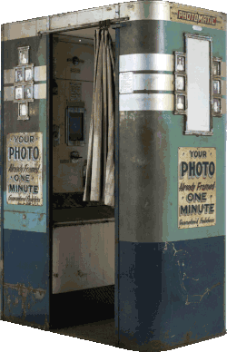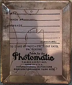 The company also produced arcade photo booths under the name of "Photomatic". These produced a souvenir 2-5/8" x 3-1/16" metal-framed photo with the credit on the back, "Taken by the Photomatic."