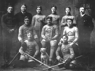 Calumet-Laurium Miners in the 1904–05 season. Front row, left to right: Fred Strike, Ken Mallen. Middle row, left to right: Dr. Bob Scott, Billy Nicholson, Jimmy Gardner. Top row, left to right: Joe Ziehr, Charles Thompson, Reddy McMillan, Hod Stuart, Clarence "Lal" Earls, Johnson Vivian.