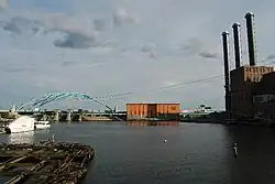 Providence River with Fox Point Hurricane Barrier. The Providence River bridge is just downstream but is not connected to the barrier. The Manchester Street Power Station is on the right.