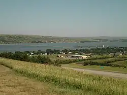 The Lake Francis Case portion of the Missouri River viewed from a rest stop just south of Chamberlain; the pre-Interstate Chamberlain Bridge is in the center