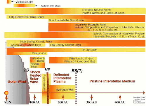 NASA produced diagram relating science goals to each region with regions farther from the Sun to the right. One AU is the distance from about the Sun to the Earth. Both Voyager 1 and 2 have passed 100 AU already. Yellow-orange color bar indicates the radial region where measurements are possible; the deepest orange is the prime region of interest.