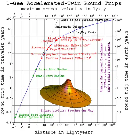 This plot shows a ship capable of 1-g (10 m/s2 or about 1.0 ly/y2) "felt" or proper-acceleration[36] can go far, except for the problem of accelerating on-board propellant.