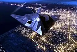 Invader was remastered with CGI for its DVD release. In this computer-generated scene, an F-117 stealth fighter flies over Washington, D.C.