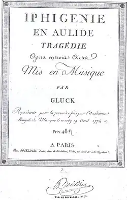 Iphigénie en Aulide (Iphigeneia in Aulis) is an opera in three acts by Christoph Willibald Gluck, the first work he wrote for the Paris stage. The libretto was written by François-Louis Gand Le Bland Du Roullet and was based on Jean Racine's tragedy Iphigénie, itself based on the play Iphigenia in Aulis by Euripides. It was premiered on 19 April 1774 by the Paris Opéra in the second Salle du Palais-Royal and revived in a slightly revised version the following year.