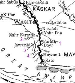 Around the same time, 'Ali ibn Muhammad made his way to the western side of the Nahr Abi al-Khasib and began construction on a settlement there.[13] Known as al-Mukhtarah, it became the "headquarters" of the Zanj for the duration of the revolt, serving as the primary residence of the Zanj leader and as a place of refuge for the rebels. From this point forward, 'Ali ibn Muhammad largely refrained from personally leading the Zanj into battle, and instead remained in al-Mukhtarah and delegated the command of his forces to his lieutenants.[14]