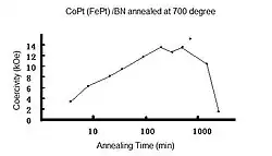 FePt NPs are promising materials for ultra-high density magnetic recording media due to their high coercivity. Higher coercivity indicates the material cannot be demagnetized easily. After annealing at 700 °C, the film can have up to 14KOe coercivity compared to common hard drives that have 5KOe coercivity.[13] Nanoparticles have also been grown with coercivities up to 37 kOe.[14]