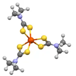 Iron tris(dimethyldithiocarbamate) is an octahedral coordination complex of iron(III) with D3 symmetry.[4]