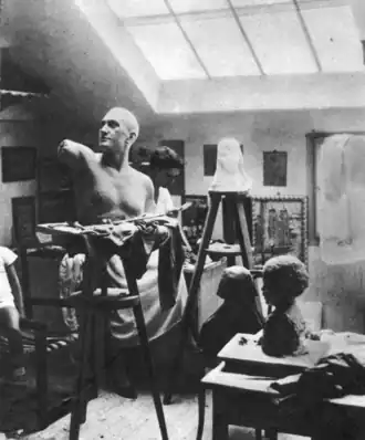 Iva Simonović was born in Hrastovica near Petrinja in Croatia-Slavonia, Austria-Hungary, on 15 August 1891.[1][a] The Simonović family were wealthy. Her father, a general in the Austro-Hungarian Army, recognized her talent and provided her with an art education.[2] She was trained by the sculptors Robert Frangeš-Mihanović and Rudolf Valdec.[1] Her first exhibition, part of the solo exhibition of her peer Ljubo Babić, took place when she was still a student.[2] Babić was interested in her romantically and painted a portrait of her.[3] Iva Simonović continued her education in Paris and Munich, training as a plaquette and medallion artist, and had an exhibition in Paris in 1914.[1][2]