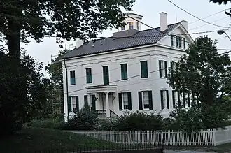 The Warde House is a fine example of residential Greek Revival architecture in Iowa.[3] It is primarily constructed in brick with decorative elements executed in limestone, wood, and metal. It measures 40 by 59 feet (12 by 18 m) and features five bays on the front and four bays along each side. The bays are divided by pilasters that support a full entablature encircling the house. The main facade overlooks the Mississippi River and is dominated by a prostyle portico. It features four wooden columns in the Corinthian order that supports a triangular pediment. A cupola rests in the center of the side gabled roof.