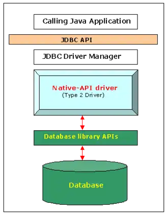 The JDBC type 2 driver, also known as the Native-API driver, is a database driver implementation that uses the client-side libraries of the database. The driver converts JDBC method calls into native calls of the database API. For example: Oracle OCI driver is a type 2 driver.