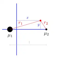One of the suitable coordinate systems used is the so-called synodic or co-rotating system, placed at the barycentre, with the line connecting the two masses μ1, μ2 chosen as x-axis and the length unit equal to their distance. As the system co-rotates with the two masses, they remain stationary and positioned at (−μ2, 0) and (+μ1, 0).[a]