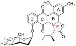A jadomycin is a natural product produced by Streptomyces venezuelae ISP5230 (ATCC10712[1]), the organism which is most well known for making the antibiotic chloramphenicol. The name jadomycin is applied to a family of related angucyclines which are distinguished by the E ring (usually an oxoazolone ring), which is derived from an amino acid. The amino acid incorporation which forms the E-ring is a chemical reaction, rather than enzymatic, an uncommon occurrence in biosynthesis. As such a number of jadomycins incorporating different amino acids have been discovered. Jadomycin A was the first compound of this family to be isolated and constitutes the angucylic backbone with L-isoleucine incorporated into the E-ring.[2] A related analog, jadomycin B, is modified by glycosylation with a 2,6-dideoxy sugar, L-digitoxose.[3] Jadomycins have cytotoxic and antibacterial properties.