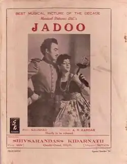 Jadoo (Magic) is a 1951 Hindi psychosocial melodrama film directed by A. R. Kardar.[1] The story writers were S. N. Bannerji and Jagdish Kanwal, with dialogues by Zahur Raja and Bannerji. The music director was Naushad, with lyrics by Shakeel Badayuni.[2] This was the second to last film in which Naushad was to be the music director for Kardar. After an association of fourteen films, Naushad composed one last time for Kardar in Deewana (1952). Prior to this Kardar had already approached composer S. D. Burman for Jeewan Jyoti (1953).[3] A "Musical Pictures Ltd." presentation, the film starred Nalini Jaywant, Suresh, Shyam Kumar, Sharda, and Ramesh.[4]