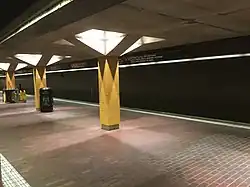 This station has tan brick walls and red brick floor on both levels. The coved trapezoidal ceilings are suspended[6]: 13 and have metal slats.