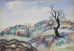 Later that year, he was given a solo exhibition of Adirondack Landscapes at the 56th Street Galleries in Manhattan.[81][note 12] In 1943, 15 years after a Red Cross benefit in the First World War, Rosenberg showed watercolors and pastels at the Ferargil Gallery with proceeds from sales once again to benefit the American Red Cross.[83][note 13] Reviewing the show in the Brooklyn Daily Eagle, the critic, A.Z. Kruse said, "Mr. Rosenberg holds his own admirably, even in this hectic week filled with proficient exhibitions." He wrote that the paintings showed "creative realism" and a "basic charm" and praised the show's watercolors as among the best then being produced.[85][note 14] "Spring Valley," shown at right, illustrates his watercolor technique at this time. Rosenberg showed at Ferargil again the following year. The show featured paintings that differed greatly from his usual serene landscapes. Some depicted what a critic called the "smoke and flame" of Pittsburgh's steel mills and others the horrors of war and oppression.[87] At that time a feature writer for the New York Post interviewed him for a lengthy profile in which he admitted that while he painted for the pleasure of it, the impetus for these paintings came from a necessity to express his feelings about the state of the world in the midst of the Second World War.[7]
