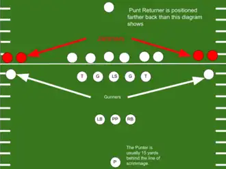 In American football, jammers are a specialized type of cornerback. Their task is to try to slow down gunners during punts by preventing them from getting a free release, giving punt returners more time to return punts.[1] Depending on the special teams strategy, a special teams coordinator may choose to double-cover the gunner. A jammer is typically played by a back-up for another position.