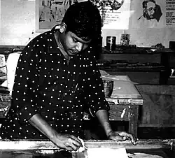 Jangarh Singh Shyam (1962–2001) was a pioneering contemporary Indian artist credited with being the creator of a new school of Indian art called Jangarh Kalam. His work has been exhibited widely the world over including Bhopal, Delhi, Tokyo and New York. His most notable exhibitions include the Magiciens de la terre in Paris (1989) and Other Masters curated by Jyotindra Jain at the Crafts Museum, New Delhi (1998). His 1988 piece Landscape with Spider sold for $31,250 at Sotheby's, New York, in 2010—a first for an adivasi artist.[1] Jangarh had also painted the interiors of the Legislative Assembly of Madhya Pradesh, the Vidhan Bhavan, and the dome of Bhopal's Bharat Bhavan—one of the most prestigious museums of tribal and contemporary Indian art. He was among the first Gond artists to use paper and canvas for his paintings, thereby inaugurating what is now known as Jangarh Kalam.[2]