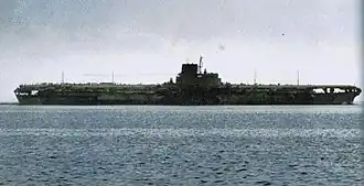 The carrier's 256-meter (839 ft 11 in) flight deck was 40 meters (131 ft 3 in) wide and overhung her hull at both ends, supported by pairs of pillars.[12] A large island, modeled on that fitted on the earlier Taihō, was sponsoned off the starboard side and integrated with the ship's funnel. Much like Taihō, the only other Japanese carrier with an armored flight deck, Shinano's flight deck functioned as the ship's strength deck and copied British practice as seen in their Illustrious-class carriers. Designed to resist penetration by 500-kilogram (1,100 lb) bombs dropped by a dive bomber, the flight deck consisted of 75 millimeters (3 in) of armor plate laid over 20 millimeters (0.8 in) of ordinary steel.[8] It was equipped with 15 transverse arrestor wires and three crash barriers that could stop a 7,500-kilogram (16,500 lb) aircraft;[13] five of these wires were positioned further forward to allow the ship to land aircraft over the bow in case the aft portion of the flight deck was unusable.[8]