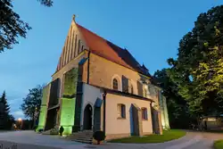 In the early days of Polish statehood, Jasło was part of the Castellany of Biecz, out of which Biecz County emerged in the 14th century. A list of rectories, created for collecting tithes, a church in "Jassel" in Zręcin deanery, Kraków diocese, is shown in 1328.[3] The area of the future town belonged to a Cistercian Abbey from Koprzywnica, and by the mid 13th century, Jasło, known then as Jasiel or Jasiol, had a fair of local importance. Together with a number of other locations in Lesser Poland, the village was granted Magdeburg rights by King Casimir III the Great, on April 23, 1366. In 1368 the king made a transaction with the Cistercian monks - in exchange for the town of Frysztak, and the villages of Glinik and Kobyle, Jasło became a royal town. It already had a parish church, founded before 1325 by King Władysław I the Elbow-high. The parish had a school, and in the mid-14th century, Carmelite brothers came to the town. According to Dlugosz in Liber beneficiorum Dioecesis cracoviensis, the church that stands today was built by brothers Stanislaw Cielatko (Czelanthco), Sandomierz scholastic, and Mikolaj of Ciołek arms, in 1446. This occurred because the original was destroyed by the Hungarians.[3] The coats of arms of Strzemie, Trąby, Gryf, Janina, and Pobóg are on the vault of the church, and because of this, the Slownik Geograficzny suggests these may be noble houses that contributed to the development.[3]