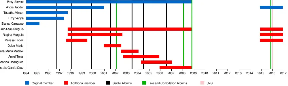 The group went through constant changes during their whole time together, even before formalizing the project when the group was created in 1994. Most of the members in the group would depart due to disagreements with manager Alejandro Sirvent (father of group member founder Patricia Sirvent) which would become source of controversy for the group and the way it was managed, with the exception of Dulce María as not only she was close with the band but the reason for her departure from the group was mostly due to landing the main role of Marcela Majía in the 2002 telenovela, Clase 406. In each of the albums the group saw a change in their line-up. During the first 12 years of the group before they reunited in 2015, a total of 13 girls became (in a more or less relevant way) part of the group.