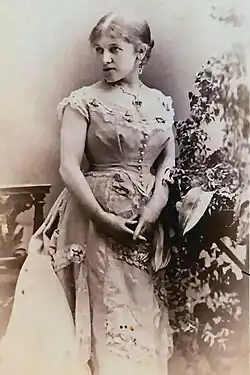 The following month Lee joined the Vokes family at the Boston Theatre, Boston, Massachusetts, as Betsey Baker in a farce-comedy entitled, The Wrong Man in the Right Place.[16][17] Lee next appeared with the Vokes family in New York at the Union Square Theatre in the William Brough comedy, Kind to a Fault.[18] and the same venue in September 1872 she joined Agnes Ethel's company, which included J. P. Burnett, in Agnes, a play written specifically for Agnes Ethel by Victorien Sardou.[19] After a serious illness, Lee returned to the Union Square Theatre on 31 December 1872 to play a principle part in J. P. Woolner's one-act playlette, Orange Blossoms.[20] She closed out 1872–73 season there playing Blanche in a comedy by M. Louis Leyroy entitled Cousin Jack.[21] On 12 June 1873, the Union Square Theatre held a benefit performance on Lee's behalf with a production of Thomas William Robertson's Caste, with the British-born actor James Henry Stoddart in the role of Eccles.[22] Afterwards Lee returned to England for a brief visit.
