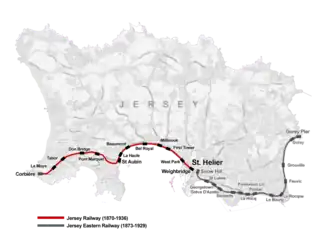![]() The Jersey Railway highlighted on a map of former railways of Jersey | |