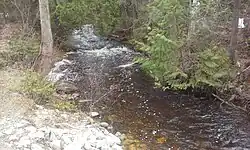 The creek begins at an unnamed pond adjacent to the old Ferguson Highway and heads westward for 0.67 km (0.42 mi) where it flows under Highway 11. It then flows an additional 0.16 km (0.099 mi) to the northwest where it enters the northeastern end of Jessie Lake.[1] The creek continues to flow northwards from the west end of Jessie Lake for 1.1 km (0.68 mi), crossing Strathcona Road then emptying into Inlet Bay of Lake Temagami.[1][2]