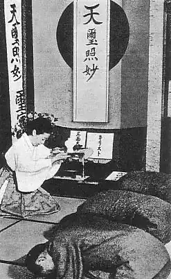 Following the surrender of Japan, the group intensified their activities, believing that a second phase of world renewal had arrived.[24] They began attempting to contact the imperial family to inform them of their role in world renewal, while enduring the occupation of Japan as divine punishment from the kami.[25] The group was constantly under threats of police arrests and eviction, leading to a series of "oracles" that dictated them to move their headquarters ("palaces").[26] After Hirohito made his Humanity Declaration in 1946, Jiu shifted their attention from the imperial family to the public.[27] A series of oracles in May 1946 declared Nagaoka as the true imperial leader of Japan, who would rule in the new Reiju (霊寿, lit.'era of the spirits') era.[28][29]