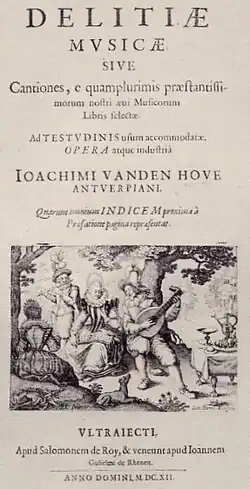 Joachim van den Hove (1567? – 1620) was a Flemish/Dutch composer and a lutenist. He composed works for lute solo and for lute and voice. Moreover, he wrote many arrangements for lute of Italian, French, and English vocal and instrumental music, and of Flemish/Dutch folk music. Van den Hove disputes with Adriaensen and Vallet the distinction of being the most important representative of 17th century Dutch lute music.