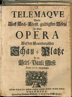 • Telemaque Wurde Auff Hoch-Fürstl. gnädigsten Befehl Jn Einer Opera Auf den Naumburgischen Schau-Platze Jn der Petri-Pauli Messe Anno 1706 vorgestellet. Boßögel, Naumburg, 1706.