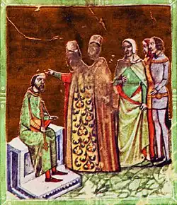Andrew sent a letter in 1214 to Pope Innocent, requesting him to authorize John to anoint his younger son Coloman as king of Galicia. Coloman was crowned by John with the pope's authorization possibly in early 1216. Pope Honorius mentioned in a letter in 1222 that John had crowned Coloman "with the blessing of the Holy See", but the circumstances of the ceremony are unknown.[44] Around the same time Andrew II requested Innocent to exempt John from the obligation to participate in the Fourth Council of the Lateran as he intended to fulfill his father's vow to lead a crusade and wished to leave his family and the realm in the care of Archbishop John. Innocent refused that as John took part in the ecumenical council in 1215, along with Berthold, six Hungarian and three Dalmatian bishops.[45] When Pope Honorius III once again called upon Andrew to fulfill his father's vow to lead a crusade in July 1216, the king, who had postponed the crusade at least three times (in 1201, 1209 and 1213), finally agreed. Departing from Hungary in July 1217, Andrew II appointed John as regent to govern the kingdom during the Fifth Crusade. The land of Tardos was returned to the Archdiocese of Esztergom on this occasion.[45] However both John and Palatine Julius Kán proved to be incapable to prevent the spread of anarchic conditions. When he returned to Hungary by late 1218, Andrew complained to Pope Honorius that his kingdom was "in a miserable and destroyed state, deprived of all of its revenues." [46] A group of barons had even expelled Archbishop John from Hungary.[47] According to Andrew's letter, John was obedient to morality rather than rebelled lords' demands and "wickedness", thus he was imprisoned and exiled "in the midst of great injustice and shame", while his wealth was confiscated by "these tyrants". John spent months of exile until Andrew's return. The king emphasized John and his canons' steadfast fidelity and bravery.[48] As compensation, Andrew donated the vineyards of Pográny (today Pohranice, Slovakia) and other landholdings (for instance, Gamás, Kapoly and Lulla) in Somogy County to John in 1218. The Chapter of Esztergom was granted the land of Alvinc (today Vințu de Jos, Romania) and its udvornici in the next year.[48]