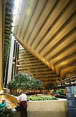 Portman was praised for his "cinematic"[12] interiors artfully relating interior space and elements to the individual. In the 1960s and 1970s the placement of such buildings in America's decaying downtowns was considered salvation of the city centers, but some contemporary city planners are critical of such insular environments that "turn their back" on the city streets.[13] For example, the New York Marriott Marquis with its 8-floor high lobby was praised as a "town square", but is now criticized by some for turning its back to Times Square. Nonetheless, at the time the hotel was built, due to the still-seedy character of Times Square, Portman's style of inwardly-oriented spaces made logical sense. Also, he did, in fact, design buildings (like San Francisco's Embarcadero Center) that heavily emphasized pedestrian activity at street level.[14]