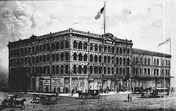 The four-story Labbe building, located on the northeast corner of SW Washington Street and 2nd Avenue, was called the "first skyscraper built in Portland" by the Morning Oregonian newspaper. When it was built in 1883, it was also the first building in Portland to have a passenger elevator.[3] Entrance halls, stairways, and the elevator shaft displayed "fine hand-carved woodwork."[4] In 1933, when the building had seen fifty years of service, one of the tenants, a sculptor, bemoaned newly announced plans for its demolition, saying that the building is "a fine example of the day's best in architecture." Unlike the "quickly built and frequently flimsily constructed buildings" of Portland's "boom" period, the building, he said, "if allowed to, would be standing after many of these more modern buildings are abandoned." The building was razed in the 1930s.[4]